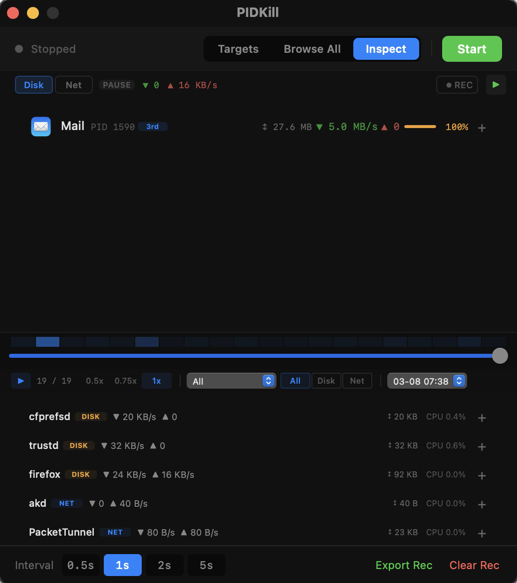 Real-time disk & network I/O ranking by process. Record sessions and replay them to trace what happened. Find the process thrashing your SSD.